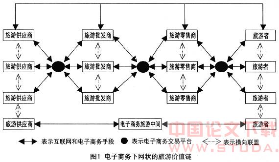 根据产业价值链的概念,我们可以把旅游价值链定义为旅游产品从供应到最终消费的一系列传递的过程,它一般由旅游产品供应商、传统旅游中间商或电子商务旅游中间商以及旅游消费者组成。传统旅游中间商一般包括旅游产品批发商和旅游产品零售商。旅游价值链传递的过程也就是旅游产品被不断增值的过程。在这一条价值链中,不同层次的旅游企业通过其职能分化和专业优势为旅游产品注入价值,最终使旅游产品得以实现。不同的旅游产品供应商为旅游者提供了不同的个别产品,实际上属于旅游产品的中间产品。旅游中间产品经过旅游中间商的组合包装后形成旅游最终产品并传递给旅游消费者。在旅游中间商中,传统旅游批发商不仅为旅游产品进行整合与包装,还注入了接待与导游服务,而传统旅游零售商则提供了咨询与代理服务。电子商务条件下,旅游价值链又出现了新的成员——电子商务旅游中间商。